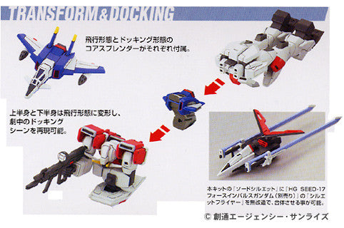 The Sword Impulse comes in a nice red and white color scheme and features a pair of snazzy Anti-Ship Swords complete with clear pink beam effects. Also included is a Beam Rifle, Shield, Beam Boomerang and Core Splendor. The model can be broken down seperating the core splendor and the Leg Flyer. The model is fully posable thanks to polycap joints.