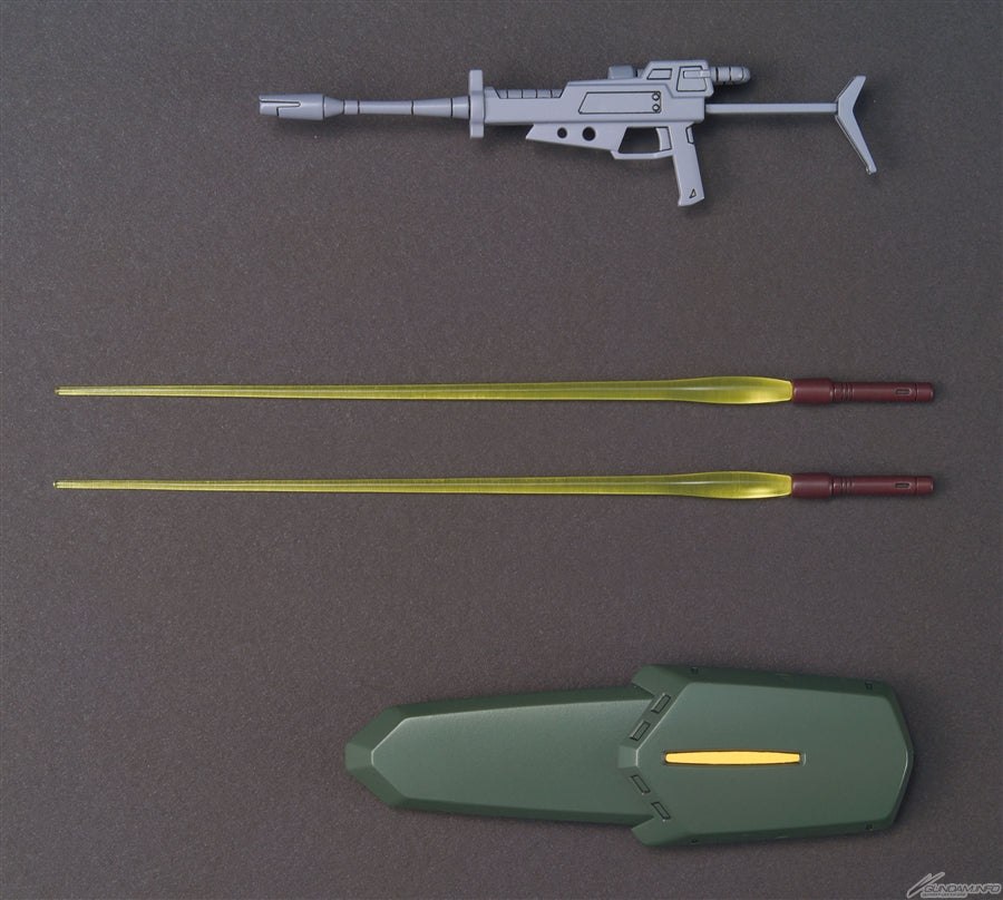 For weapons, the Galbaldy ???? is equipped with a standard beam rifle, a pair of beam sabers stored in the shoulders, a pair of signal launchers in the hands, and a new Federation-designed shield with a pair of single-use missile launchers to replace the Zulu-style shield of the original Galbaldy ????.